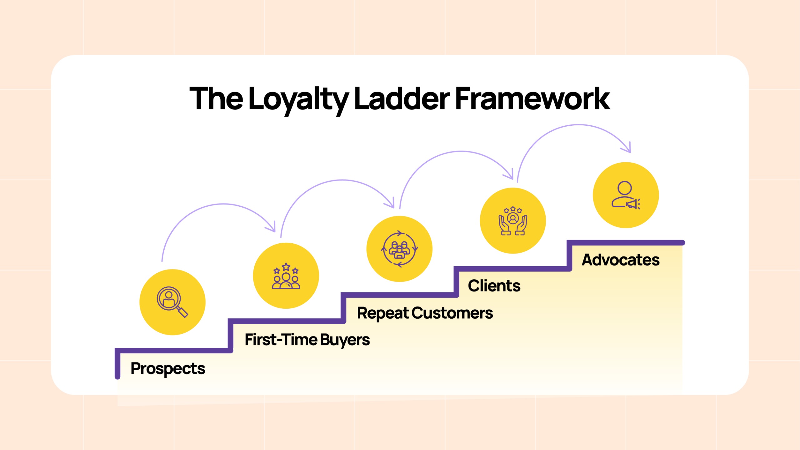 The Loyalty Ladder Framework maps out the progressive stages customers move through on their path from awareness to full advocacy. Instead of viewing loyalty as a binary state, this model breaks it down into five key steps: