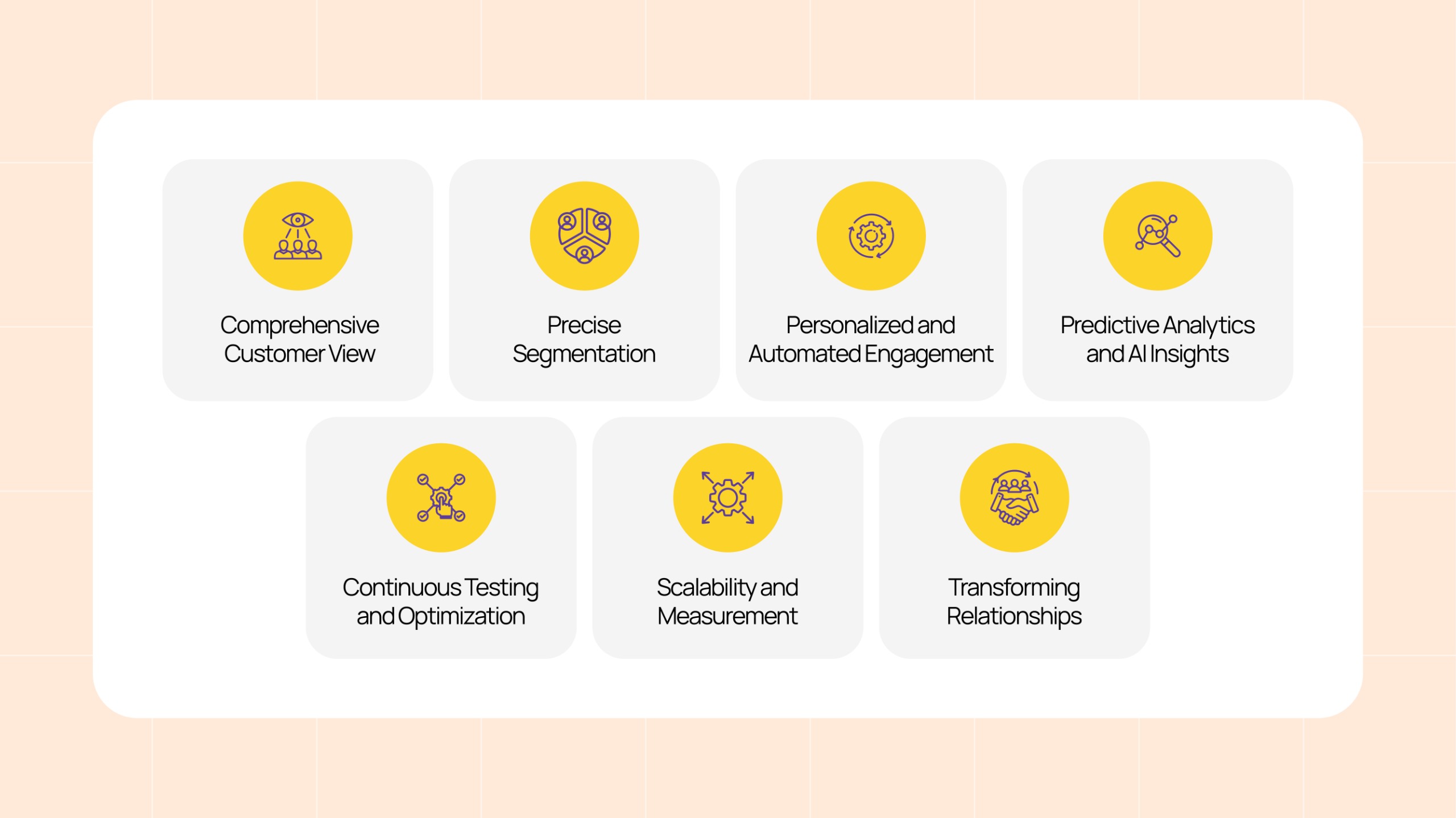 Modern CRMs use AI to analyze patterns and predict customer behavior, helping you proactively identify at-risk customers, upsell opportunities, or ideal moments to move customers up the ladder. - Continuous Testing and Optimization: