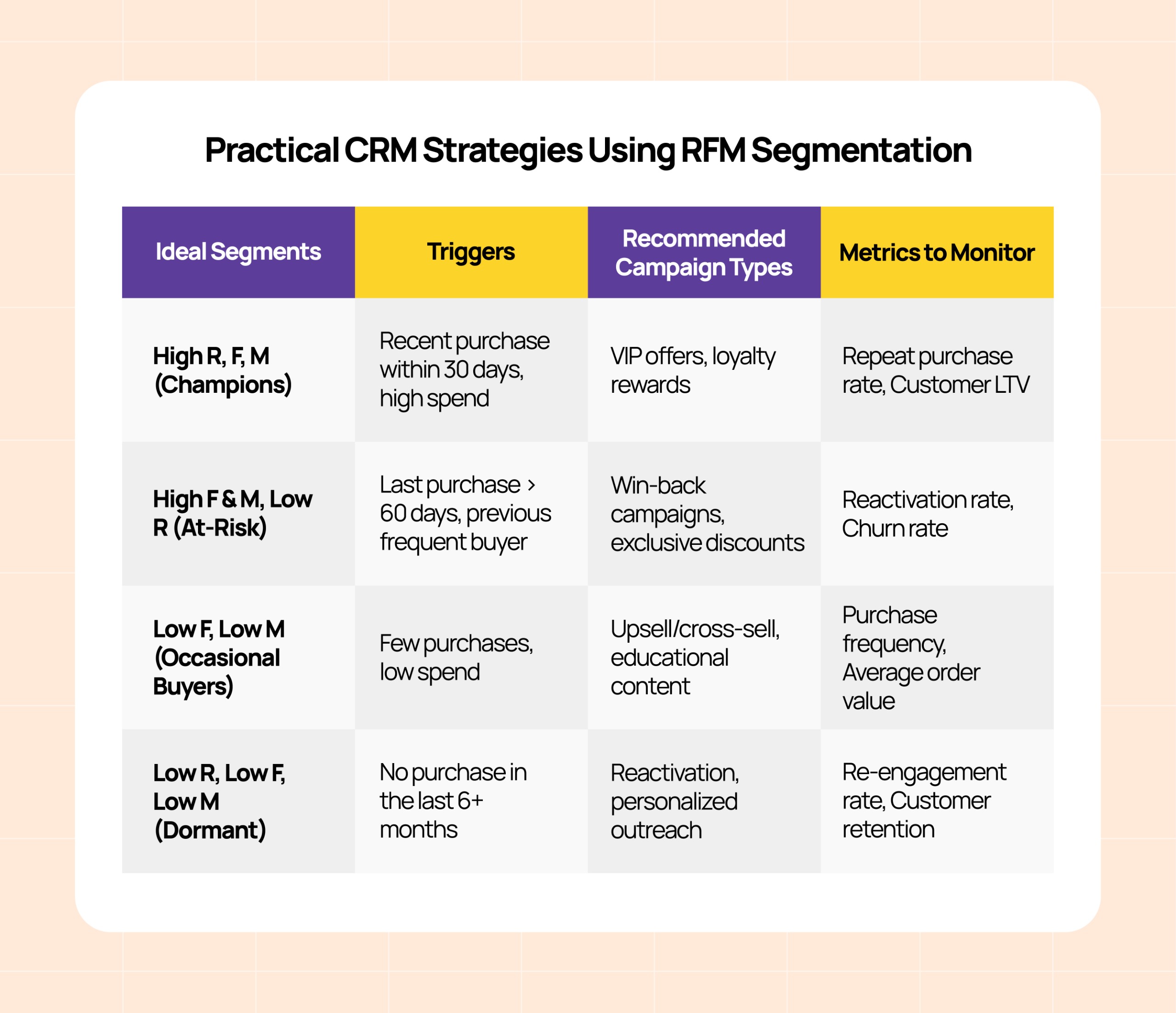 The following playbook outlines common segments, the conditions that identify them, recommended campaign types, and key metrics to track success, giving you a practical roadmap to apply RFM effectively and drive better marketing outcomes.